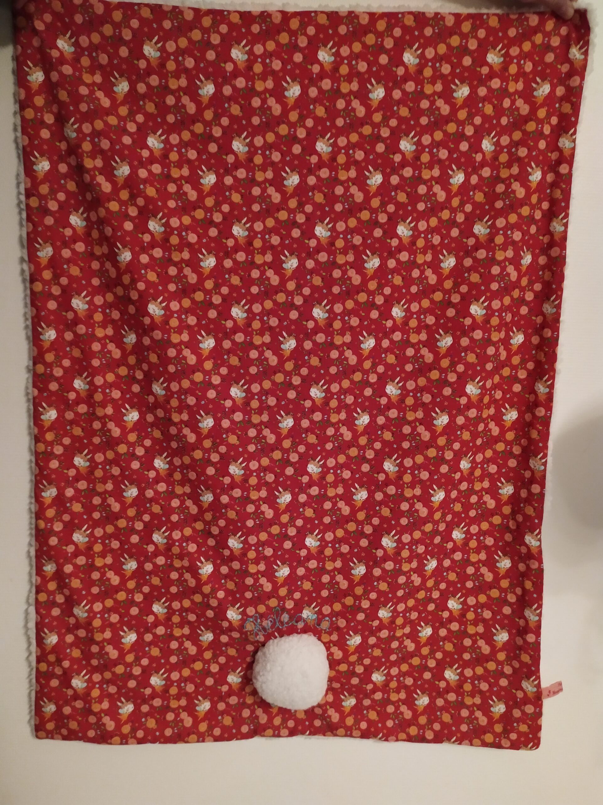 Alana m’a demandé de créer une couverture bébé pour la naissance d’Héléana. Le choix tout doux du motif lapin s’est imposé.